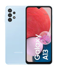 Samsung Galaxy A13 . Display diagonal: 16.8 cm (6.6"), Display resolution: 2408 x 1080 pixels, Display type: TFT-LCD. Processor frequency: 2 GHz, Processor family: MediaTek, Processor model: Helio G80 (MT6769V). RAM capacity: 4 GB, Internal storage capacity: 64 GB. Rear camera resolution (numeric): 50 MP, Rear camera type: Quad camera. SIM card capability: Dual SIM. Operating system installed: Android 12. Battery capacity: 5000 mAh. Product colour: Light Blue. Weight: 195 g