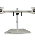 Increase your productivity and free up desk space with this dual-monitor stand. The free-standing mount lets you install two displays up to 24”, side by side, on a single base that you can place in virtually any workspace. The silver finish adds a designer touch to your office decor.